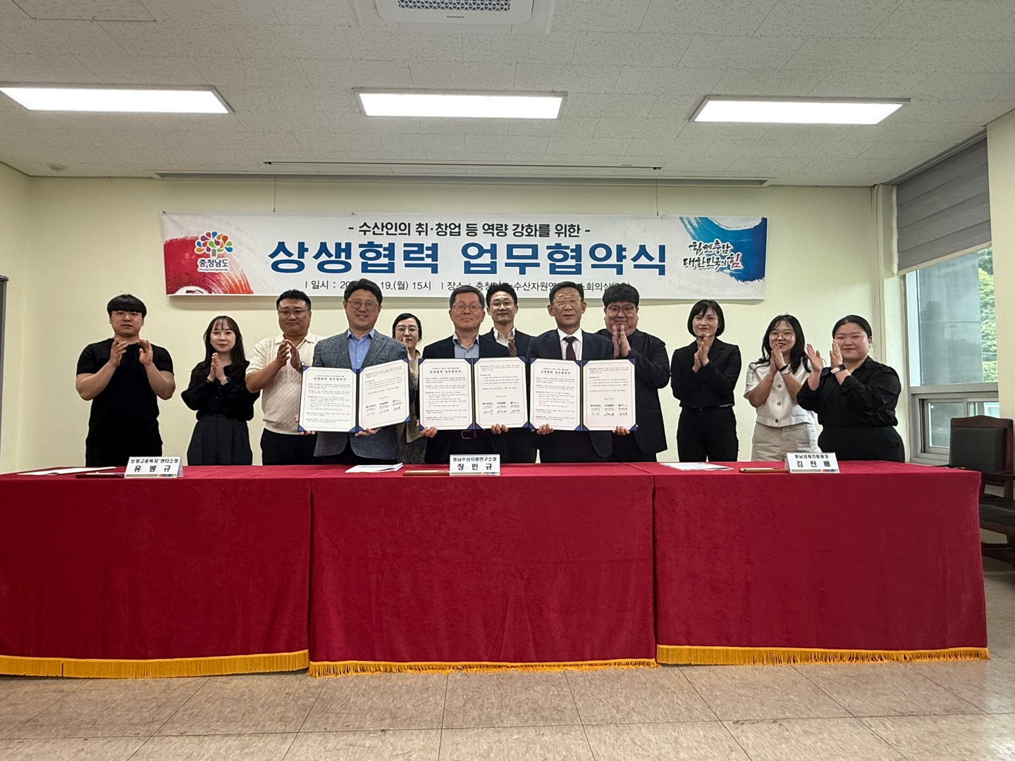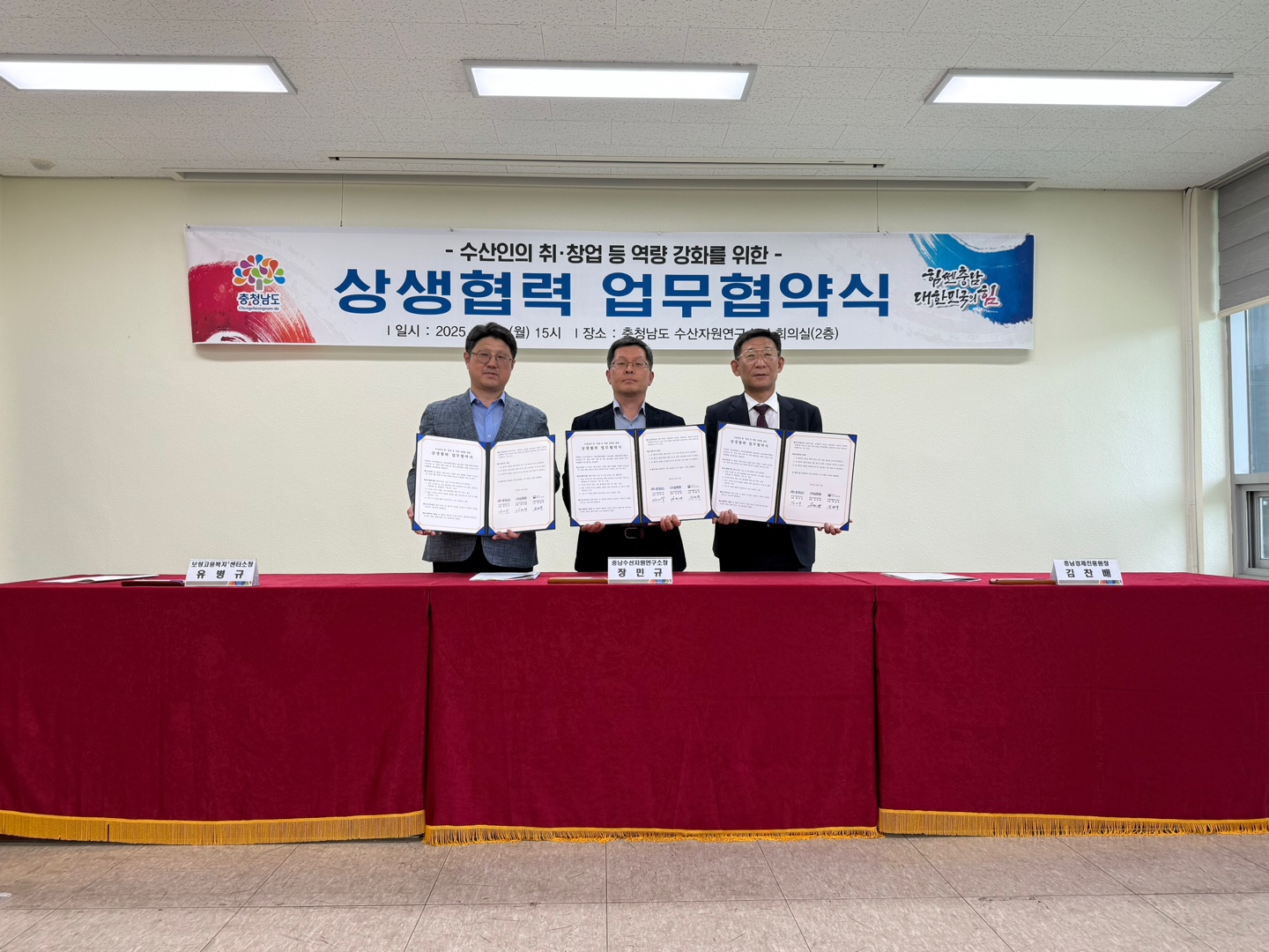 충남도 수산자원연구소는 19일 연구소 소회의실에서 고용노동부 보령고용노동지청 보령고용복지+센터(이하 ‘보령고용복지플러스센터’), 충남경제진흥원과 ‘수산인의 취·창업 등 역량 강화를 위한 상생 협력 업무협약’을 체결했다.